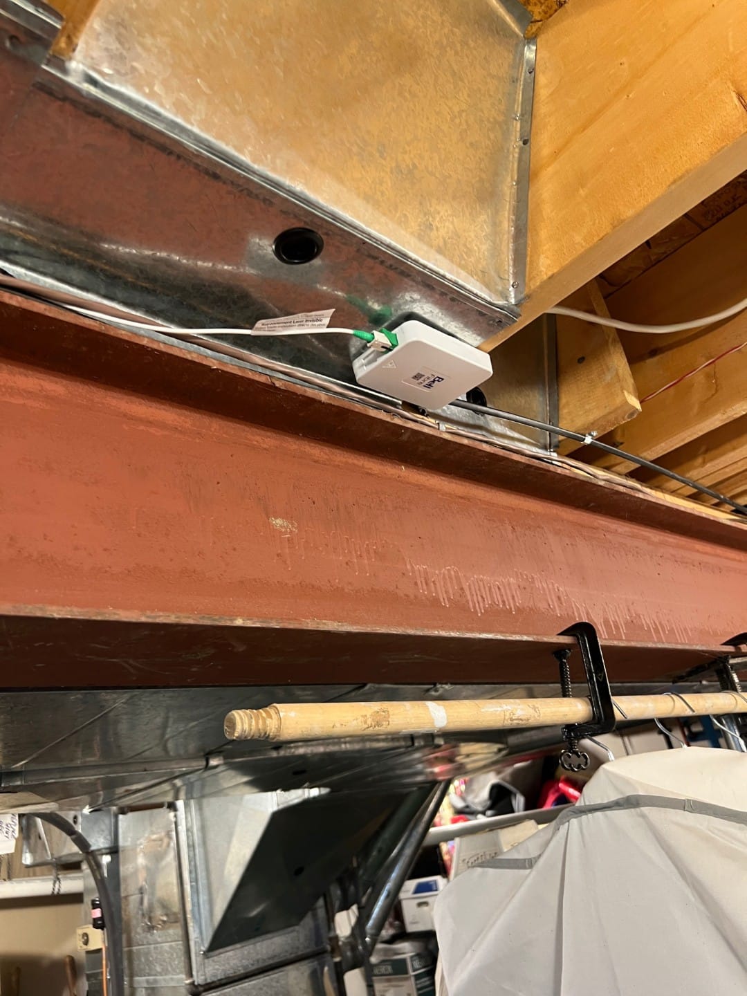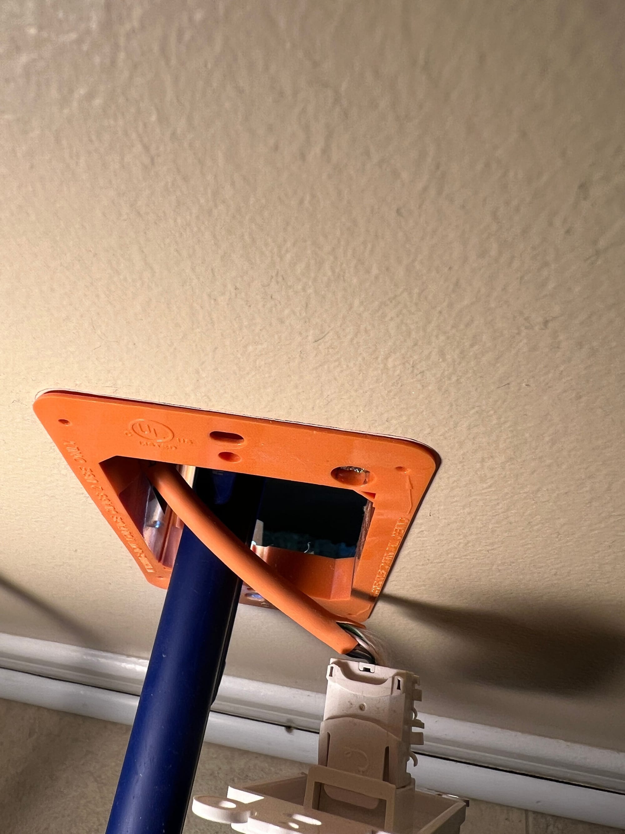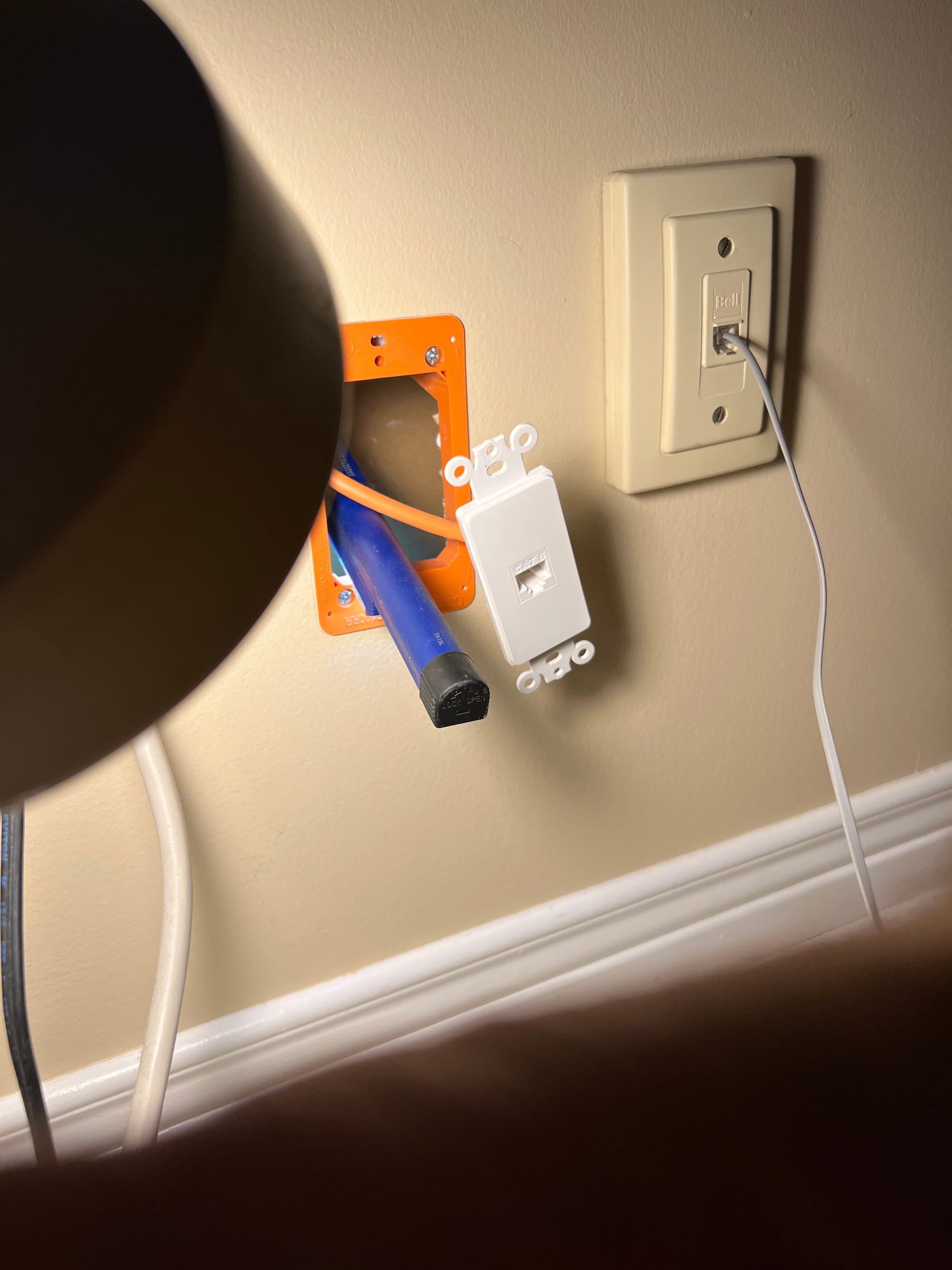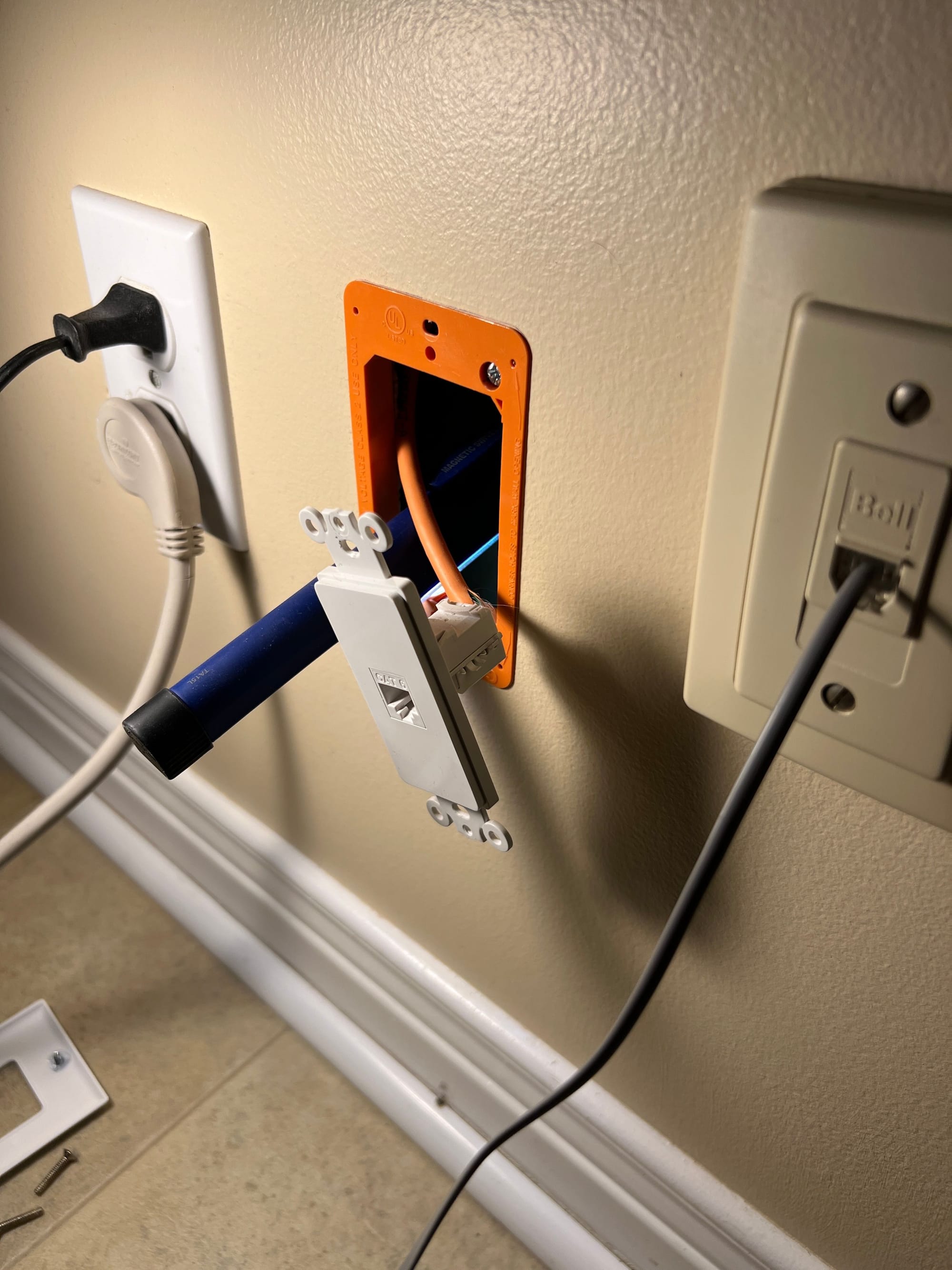 The installer then added a 5m optical extension cable, routed up to the kitchen using an existing hole in the sub-floor used to route a CAT6 cable. He notched the wall-plate of the ethernet receptable with a pair of side-cutters to allow the fibre cable to pass-through to the ONT (not shown below).