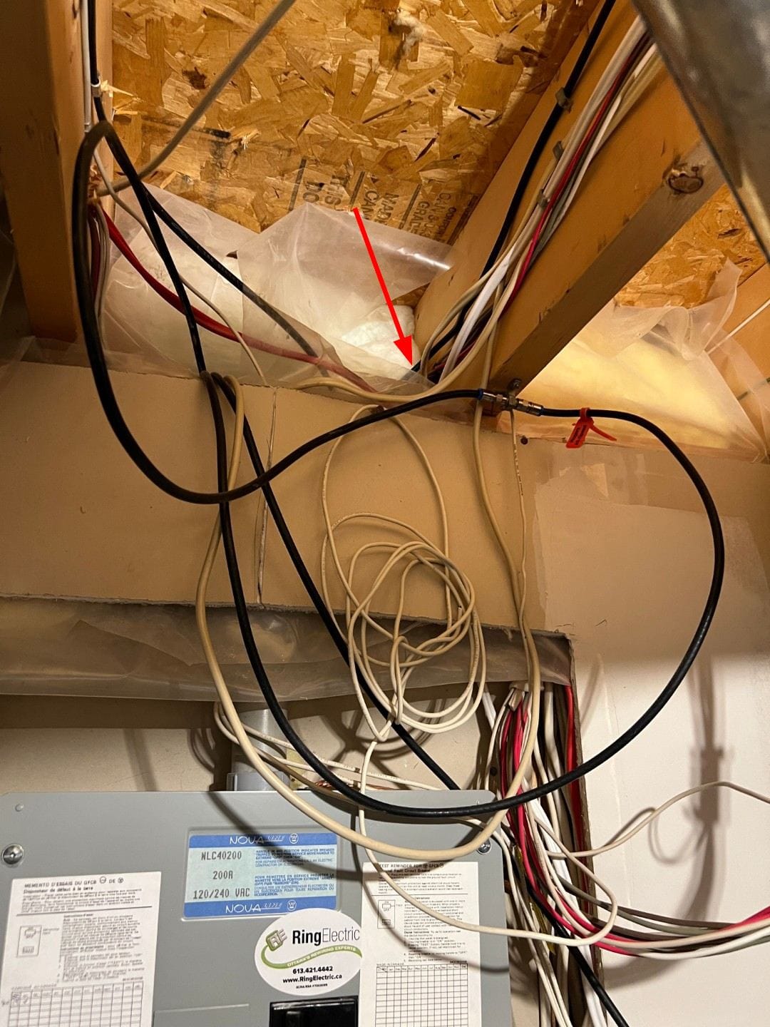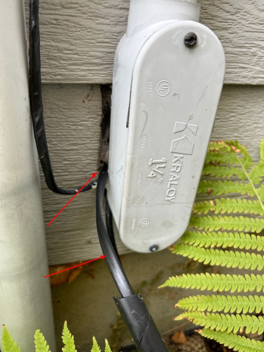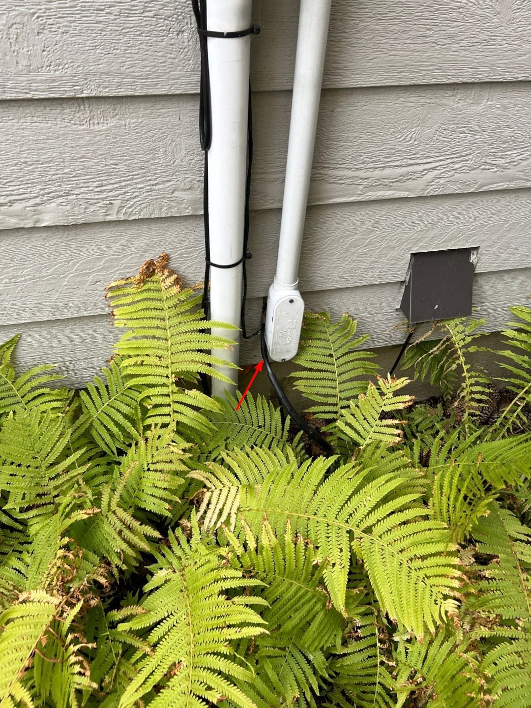 The optical fibre cable was looped and zip-tied nearby initially. The installer simply uncoiled it and pushed the end through the caulking around the metered hydro input conduit to my house, as shown below by the red arrow. He did not have to drill any holes. He did not add more caulking, so I'll probably have a look at that to ensure there are no gaps for insects to crawl in.